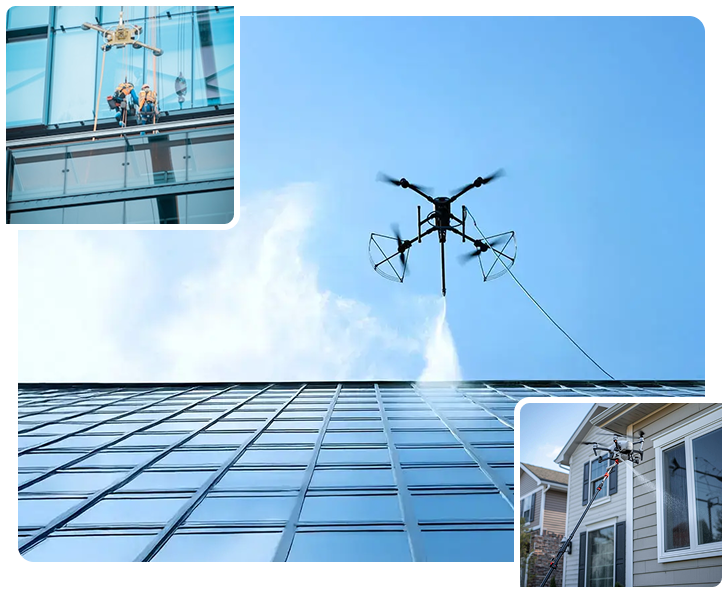 We use advanced drone technology to clean building exteriors, windows, roofs, solar panels, and hard surfaces faster and safer than traditional methods. For commercial properties and residential homes.